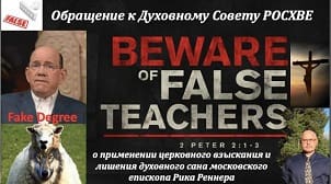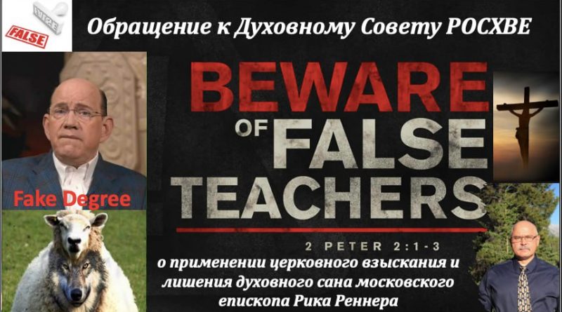 Доктор богословия Александр Лихошерстов опубликовал обращение к Духовному Совету Российского объединённого Союза христиан веры евангельской (пятидесятников) о применении церковного взыскания и лишения духовного сана московского епископа Рика Реннера в связи с его обманом,