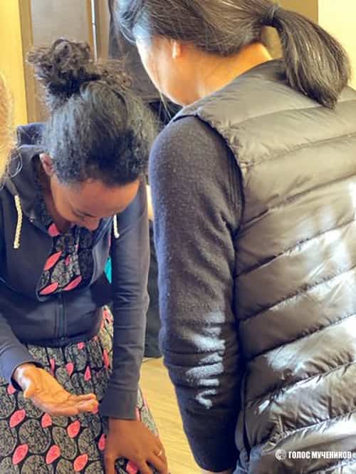 Представник організації «Голос мучеників» доктор Хен Сук Фолі молиться разом із еритрейською вдовою. Її чоловік помер у в'язниці в Еритреї за свою віру.