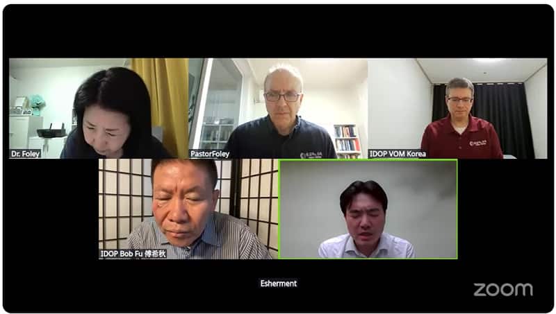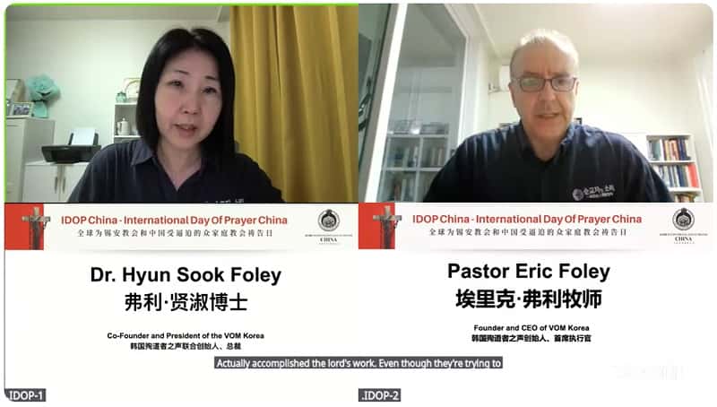 Представник організації «Голос мучеників — Корея » доктор Хен Сук Фолі та генеральний директор пастор Ерік Фолі ведуть двогодинну частину східноазіатського сегменту 24-годинної глобальної молитовної естафети на підтримку церкви «Сіон».